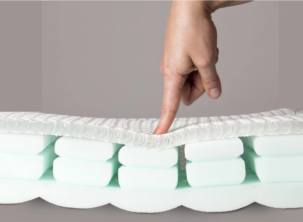 Reálny prierez matracom: 3D sieťovina a Cubic System pre maximálnu priedušnosť.