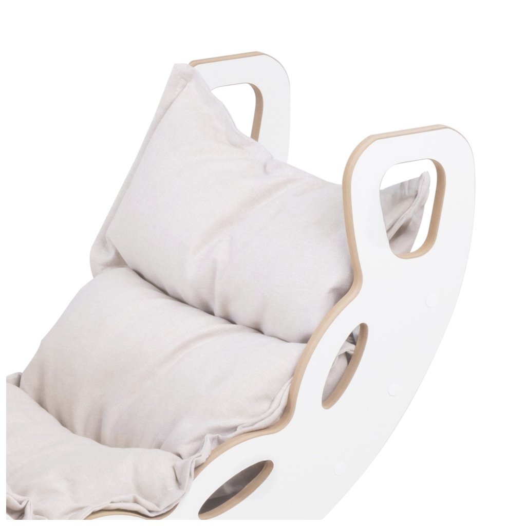 Rocker z MDF, vankúš z odolného a príjemného textilu (100% polyester), laminované povrchy, bezpečné a certifikované materiály vhodné pre deti.