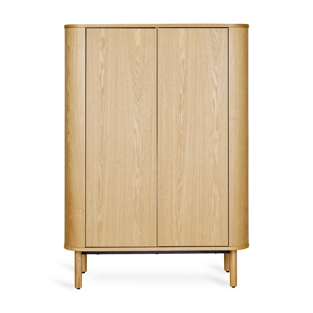 Nohy skrine sú vyrobené z masívneho jaseňa, ktorý jej dodáva stabilitu a luxusný prirodzený vzhľad. Predné dvierka sú vyrobené z kvalitnej MDF dosky s jaseňovou dyhou, čo zaručuje vysokú odolnosť aj krásnu kresbu dreva. Otváranie pomocou push systému zabezpečuje tichý a jemný chod bez rušivých úchytiek.